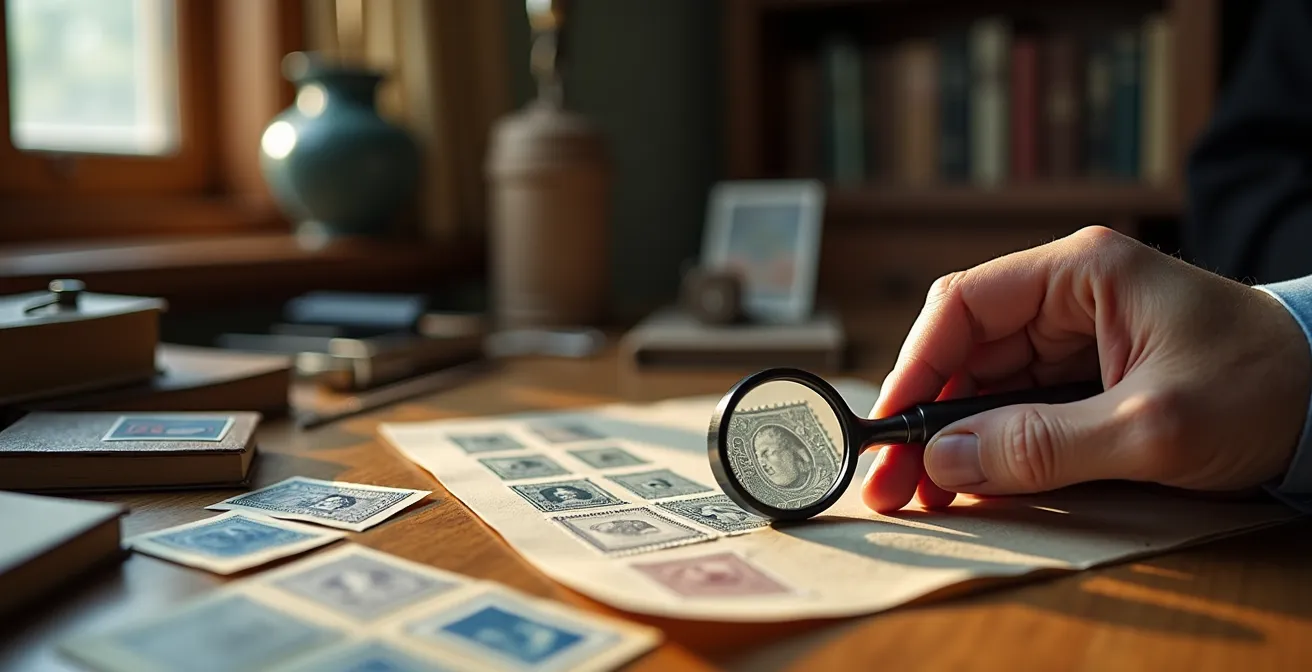 Le compte-fils est bien plus qu’une simple loupe ; c’est l’outil d’expertise par excellence du philatéliste. Il permet de passer de la simple observation à un diagnostic précis de la qualité d’impression d’un timbre. Son fort grossissement révèle des détails invisibles à l’œil nu qui peuvent confirmer ou infirmer l’authenticité d’une pièce, ou encore estimer sa place dans le tirage. Comme le souligne une source de référence, une loupe ou un compte-fils est essentiel pour « examiner les détails du timbre et repérer, soit les éventuelles détériorations qui en diminuent ou suppriment la valeur philatélique, soit les variétés qui au contraire peuvent en accroître la valeur ». Face à un timbre douteux, l’expert applique un protocole d’analyse systématique.